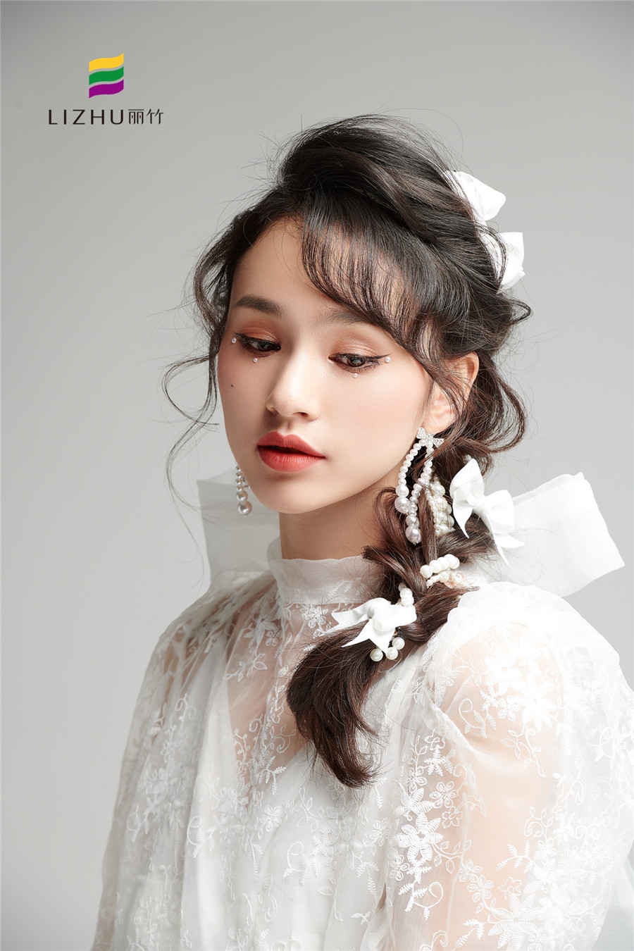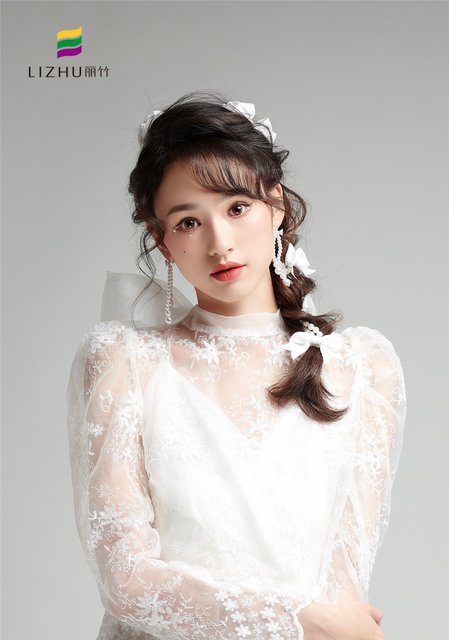 廣西化妝培訓(xùn)學(xué)校(麗竹化妝學(xué)校)---甜美時尚新娘造型:簡約的便面編發(fā),搭配優(yōu)雅的白色蝴蝶結(jié)點綴。素雅動人,甜美優(yōu)雅,無須濃墨重彩,即可打造氣質(zhì)恬靜新娘。