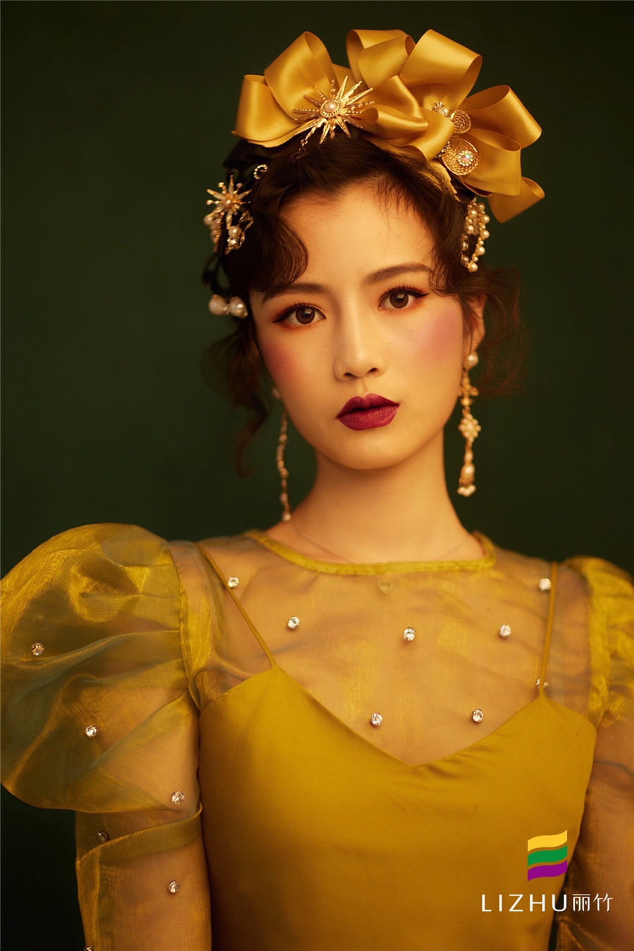 油畫妝容造型:復古手推波營造的優(yōu)雅感,佩戴金光亮閃的珍珠頭飾,極具張力的色系妝容打造,營造出了古典優(yōu)雅韻味,又不可抗拒的文藝氣息,如油畫里走出來的女王。