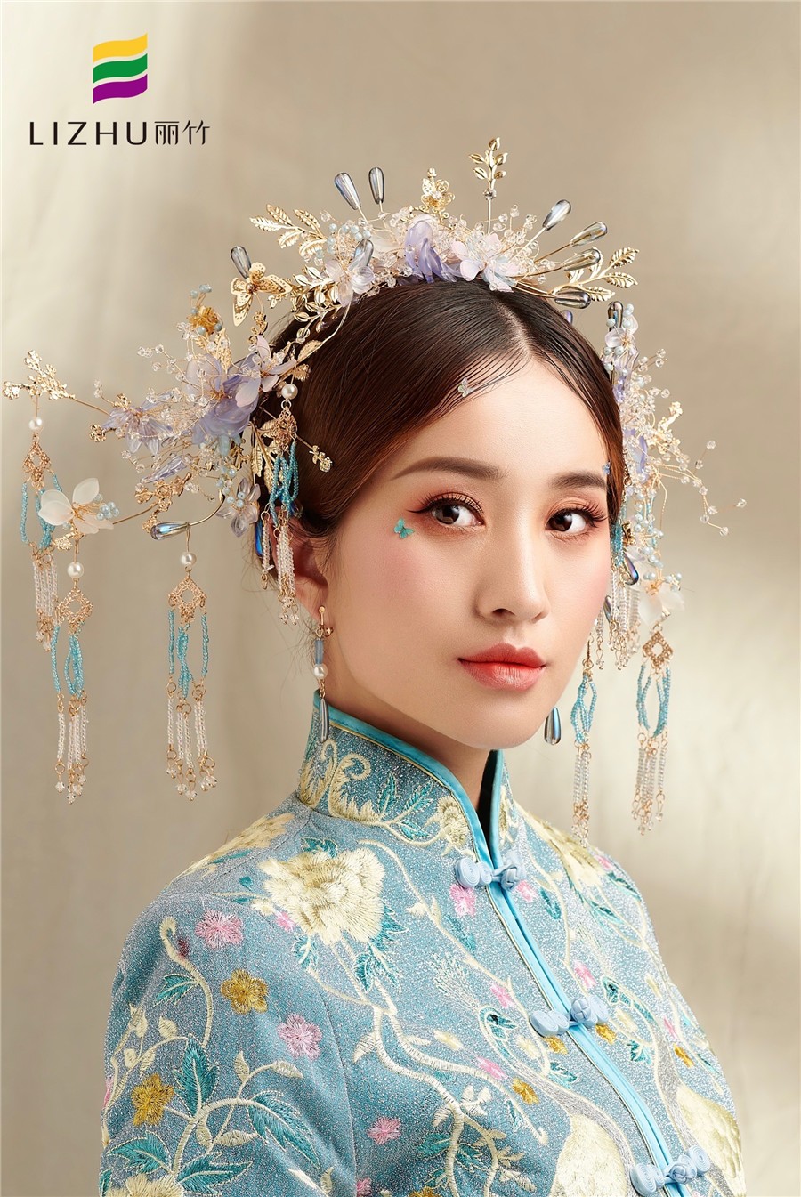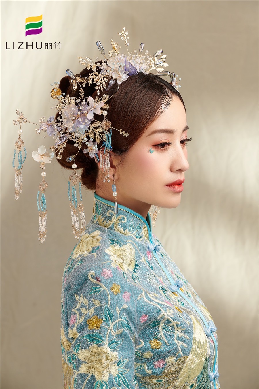麗竹學(xué)校彩妝作品---中國藍(lán)秀禾新娘造型:簡潔優(yōu)雅的盤發(fā),配上秀麗柔美的妝容,滿眼柔情溢出眼角眉梢,極具優(yōu)雅端莊大方之余,更加顯得姿態(tài)婀娜多姿。