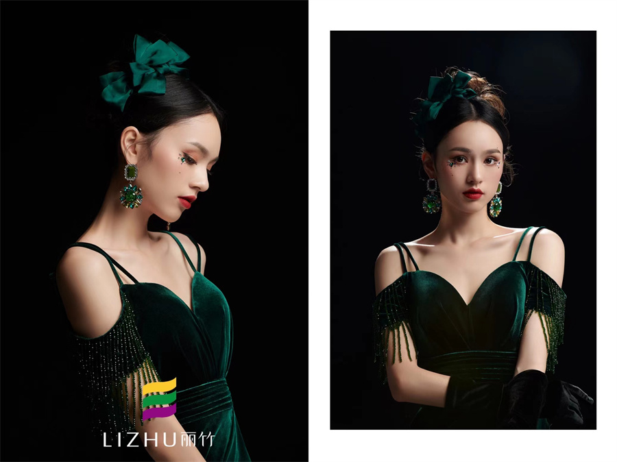 整體墨綠的色系搭配,打造嬌俏可人的妝容,配搭夸張墨綠鉆石耳飾以及綢制蝴蝶結(jié),與絨面吊帶珠子點(diǎn)綴的流蘇禮服相互碰撞,繾綣詩意,復(fù)古迷人。