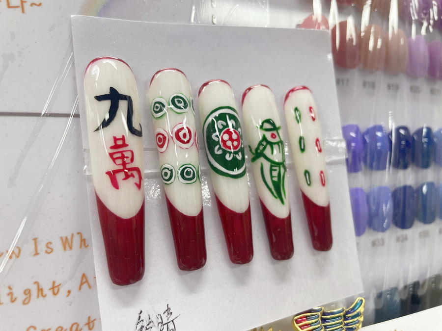 南寧美甲訓(xùn)練、南寧美甲作品:面對成千上萬款美甲,身為美甲控的你想好給自己做什么款式的美甲了么?如果還沒有,南寧美甲職業(yè)學(xué)校推薦你可以可以試試南寧美甲造型進修班同學(xué)們繪制的畢業(yè)作品。這便是新年里建議大家一定要嘗試做的美甲款式---麻將美甲。