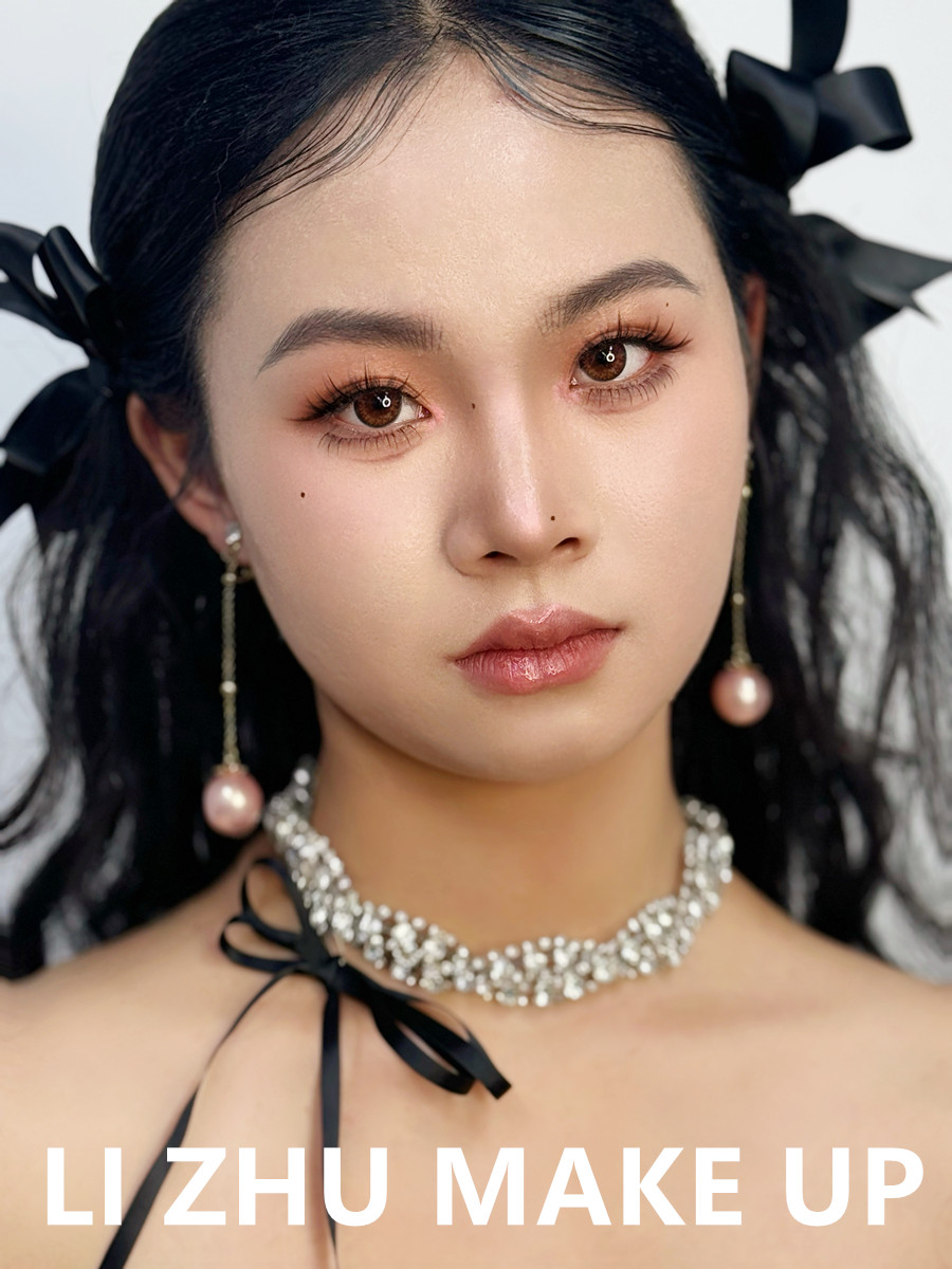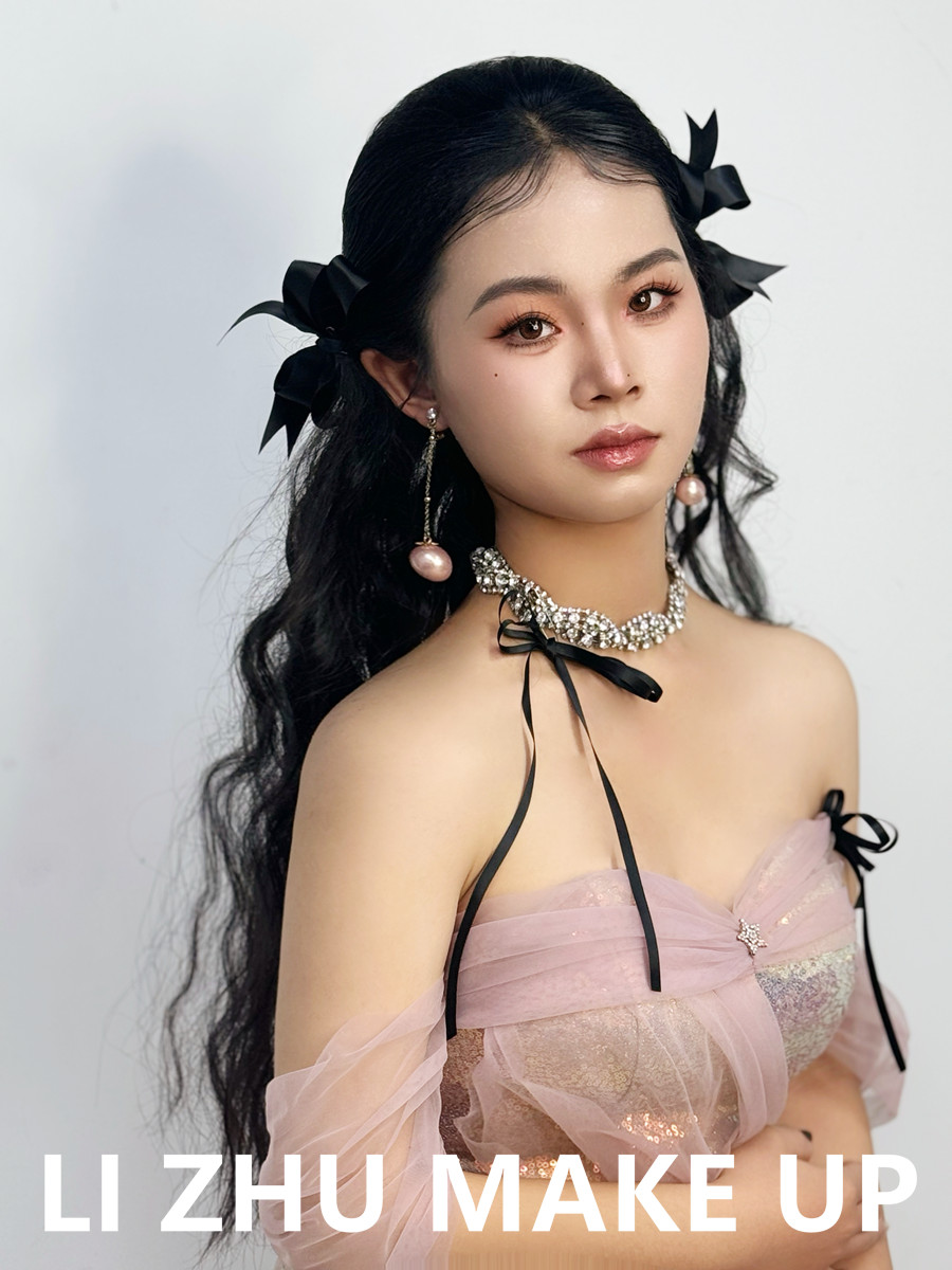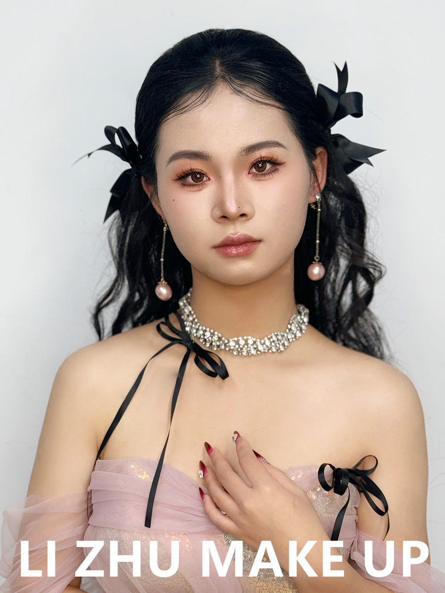 南寧化妝形象設計、南寧學化妝零經(jīng)驗、南寧化妝培訓進修提升(麗竹化妝造型學校)作品---韓式甜美新娘:自然服貼的韓式底妝,粉橘色亮眼的眼妝和唇妝,成套蝴蝶結飾品點綴,讓身著粉色紗質禮服造型更加甜美。