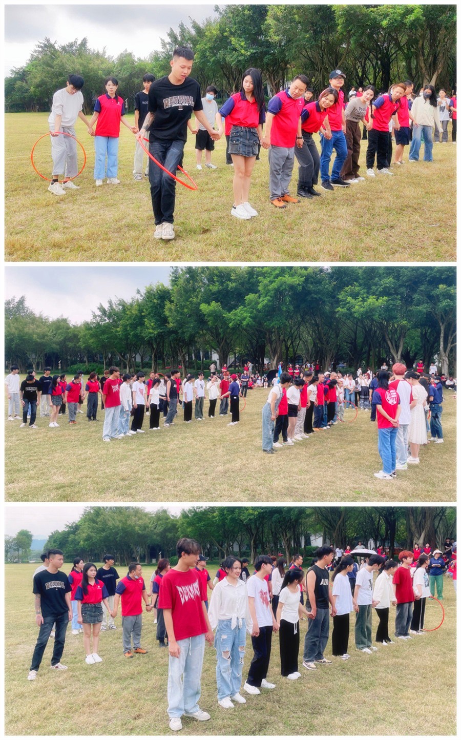 同學(xué)們手拉手圍成一圈,相互拉著的手不能放開(kāi),也不能用手指去勾呼啦圈,用呼啦圈穿過(guò)所有人的身體回到原位,用時(shí)快的隊(duì)伍獲勝??粗鴪?chǎng)上同學(xué)們奮勇拼搏,場(chǎng)外的同學(xué)高聲吶喊加油,氣氛熱烈,彰顯出同學(xué)們的熱情與青春活力。