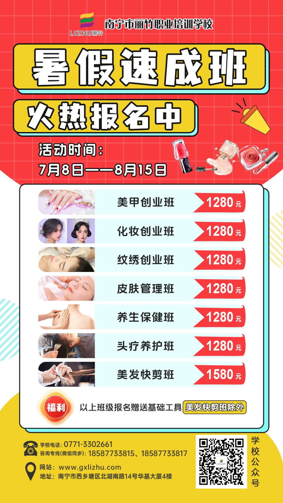 如果你想在廣西學美容美發(fā),想知道廣西化妝美甲學費多少?想知道廣西紋繡去哪學……那就千萬不要錯過廣西美容美發(fā)化妝美甲(麗竹學校)暑假速成班推出的課程報名活動啦!